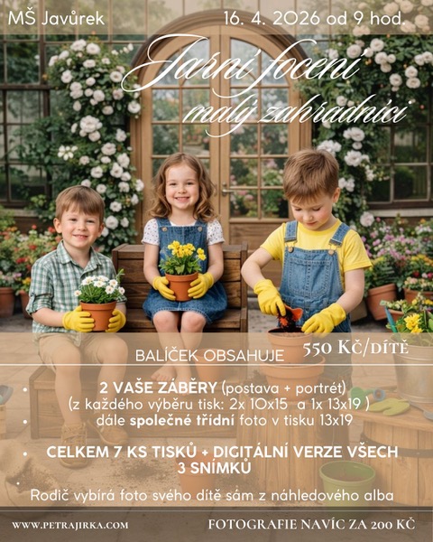 Přichází jaro a s ním i téma našeho letošního focení. Tentokrát se děti promění v malé zahradníky – budeme fotit v atmosféře rozkvetlého skleníku při sázení kytiček.